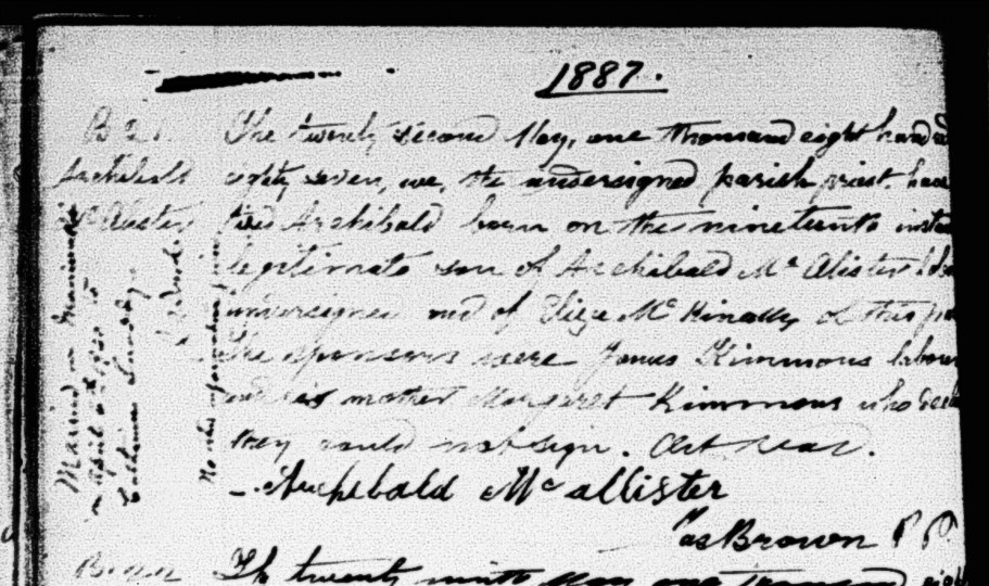 The first baptism we find is that of Archibald McAlister who will be known as Archie McAllister. The baptism takes place in St. Stephen Church, Chelsea, on May 22, 1887. It is mentioned that his father is a laborer and that his parents live in the parish. The godfather is James Kimmons and the godmother is his mother Margaret Kimmons. The father of the child signs the baptismal certificate. This baptism also confirms that Eliza did not give birth to a child on the boat during the crossing because we know that the date of birth of Archie is May 19, 1887 and that the date of the arrival of the boat is October 10, 1886. So, we can deduce that Eliza was pregnant with Archie during the crossing.
