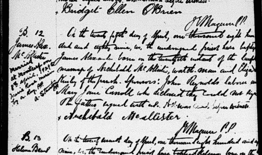 The third child born in Canada is William Samuel McAllister who is known as William. He was born on January 16, 1891 and was baptized on January 25, 1891 in Saint Stephen, Chelsea. It is stated that Archibald is a laborer and still lives in this parish with his wife. The godparents are Charles McClosky and Bridget Field.