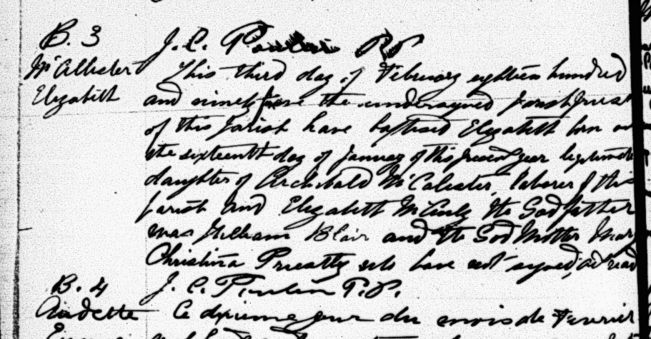 Where will they be located exactly? Hard to say since we did not find any notarial act of land purchase concerning Archibald McAllister. In addition, the mention of Ottawa in the passenger list is confusing: it may refer to the city of Ottawa or the County of Ottawa, which at that time covered the whole territory of the Outaouais (from Hull to Maniwaki, including Pontiac and Petite-Nation). Fortunately, the baptism of the couple’s children gives us an important clue.