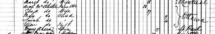 The Canadian history of our McAllister branch began on October 10, 1886, in Quebec City. Archibald and his wife Eliza arrived on the Sarmatian that had departed on October 1st from Londonderry, a port in the north of Ireland. They were accompanied by their three daughters (Mary, Sarah and Ellen who will be known as Nellie) and they were going to Ottawa as evidenced by the list of passengers. The oral history of the family tells us that Nellie was born on the boat. However, the passenger list tells us that she is one year old. She would have been born in Ireland.