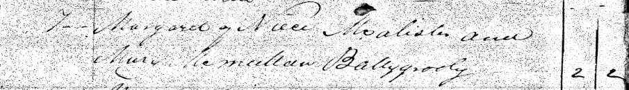 It is certain that Mary McMullan is pregnant at the time of her marriage since a few months later, on September 7, 1833, her daughter Margaret McAllister is baptized. The baptism is recorded in the register of the parish of Drumaul. The act mentions that the parents are from Ballygrooby.
