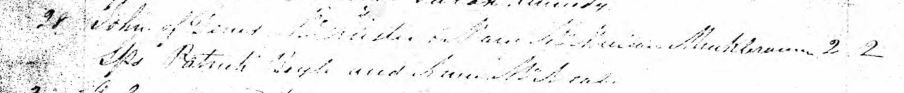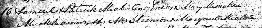 It took four years before the Drumaul parish register record other acts concerning Ennis and Mary’s children. These are the baptisms of two boys: Samuel and Patrick McAllister. The parents declare to be Muckleramer. The witnesses are Mrs. Steenson and Margaret McAlister.