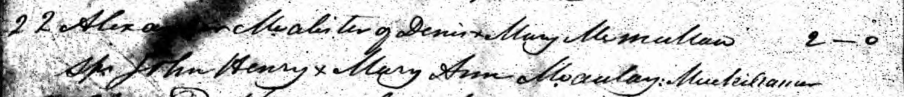 The register of Drumaul Parish records the baptism of another child of Ennis McAllister and Mary McMullan: Alexander McAllister. His godfather is John Henry and his godmother is Ann McAulay of Muckleramer.