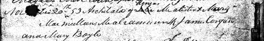 The information we have about Ennis McAllister and Mary McMullan is very fragmentary since the parish registers of the day contain little information. In addition, the naming of first names and last names is very variable. For example, for Ennis, we will also find Denis, Dennis, Eneas, Niece, Inis, Aeneas, Eeneas; for McMullan we will see McMullen and McMullun.