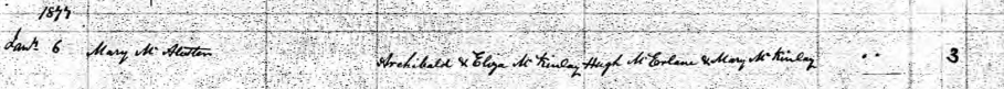 The firstborn child of the marriage of Archibald McAllister and Eliza McKinley is Mary McAllister. It was impossible for me to trace Mary McAllister’s birth in the registers of civil status. However, her baptismal certificate was recorded in the united Catholic Parish Register of Drumaul, Antrim and Connor on January 6, 1877. Her godfather is Hugh McErlane and her godmother is Mary McKinley, most likely her aunt.