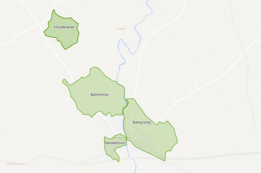 Randalstown and townland maps of Ballygrooby, Ballytresna and Muckleramer all part of Drumaul Parish. Interactive map.