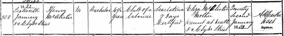 Then there is an act for the death of Henry McAllister in the vital statistics records. The four and a half-year-old boy died on 16 January 1883 of scarlet fever. His parents report living at 50 Clyde Street in Belfast. His mother was present at the time of the death.