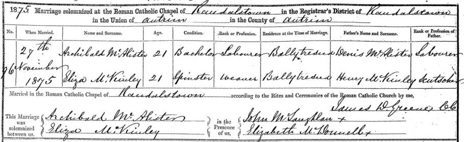 The civil registration of marriage offers much more information. First of all, the wedding location is much more precise. The wedding took place in the Randalstown Catholic Chapel in County Antrim. Archibald is a 21-year-old bachelor. He is the son of Denis McAlister [Ennis McAllister] and is a labourer just like his father. Eliza is a 21-year-old spinster and is a weaver. Her father, Henry McKinley is a scutcher, which means that he operates an implement for separating hemp or flax from the stalk. Archibald and Eliza live in Ballytresna, just north of Randalstown.