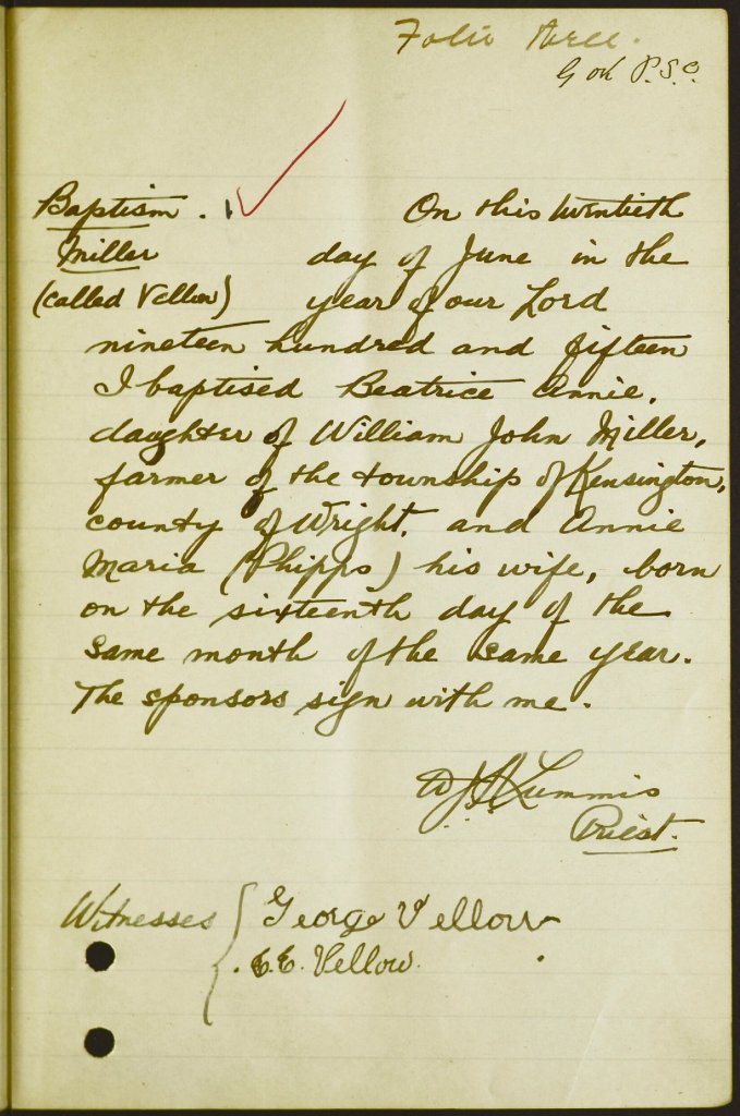 Beatrice Annie Millar was born on June 16th, 1915, and baptized on the 20th at the Anglican church of Maniwaki. Her parents were William John Millar and Annie Maria Phipps. She is the last of 8 children born from their marriage, the others being born between 1891 and 1911. In order : George Arthur, Edith, Agnes, Mamie, Lillian, Dora and Mildred.