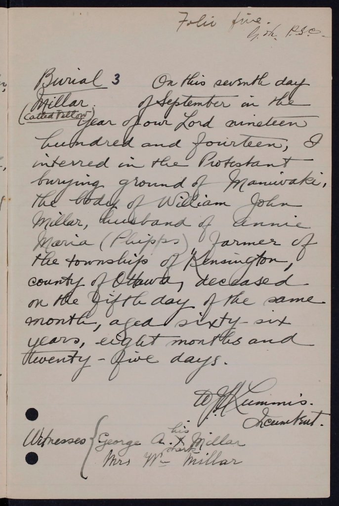 Whoever digs a little more on the Millar family eventually finds the burial of Beatrice Millar’s father, William John Millar, in the records of the Maniwaki Anglican church. The burial is recorded on September 7, 1914, and the death occurred two days earlier, on September 5. William John Millar is said to have been 66 years, 8 months and 25 days old. That is precise! He was a farmer from Kensington Township and was husband to Annie Maria Phipps.