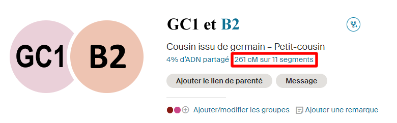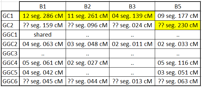 From this first analysis, we can see that GC1 is the grandchild who shares the most DNA with B1 sharing 286 cM dispersed in 12 segments. Taken alone, this information allow us to draw limited conclusions. According to the Shared cM Project 4.0 tool v4, the most probable relationship between B1 and GC1 would be half great-great-niece/nephew, second cousin, half first cousin once removed or first cousin twice removed all with a probability of 59 %. Because of the age of both B1 and GC1, it is possible to eliminate the half great-great-niece/nephew relationship.