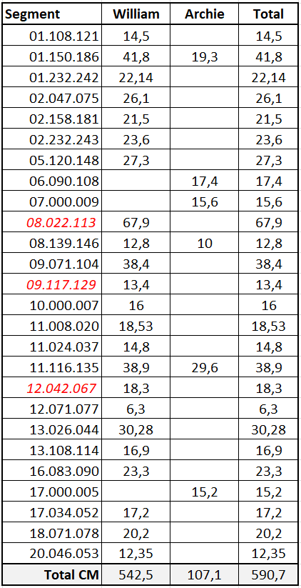 This breakdown requires a few comments. First of all, the cM of three of these segments, those shown in red, are underestimated. They are combined segments of overlapping smaller segments. I simply took the cM value of the longest segment from which they were combined. For example, the segment on Chromosome 8 that runs from 22 to 113 is a combination of two segments, one running from 22 to 58 being 29,6 cM long and the other from 27 to 113 being 67,9 cM long. Only that last value of 67,9 cM has been considered. Let’s also note that the 107,1 cM shared with Archie’s branch is limited because the information comes from only two descendants : one great-grandchild and one great-great-great-grandchild. The McAllister DNA has been diluted over the generation.