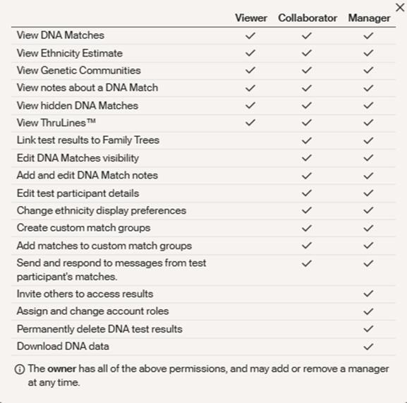 Basically, If you simply wish to share your DNA results with family, friends or other genealogists, the Viewer Role is probably the best to give.