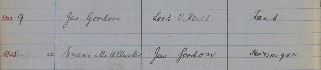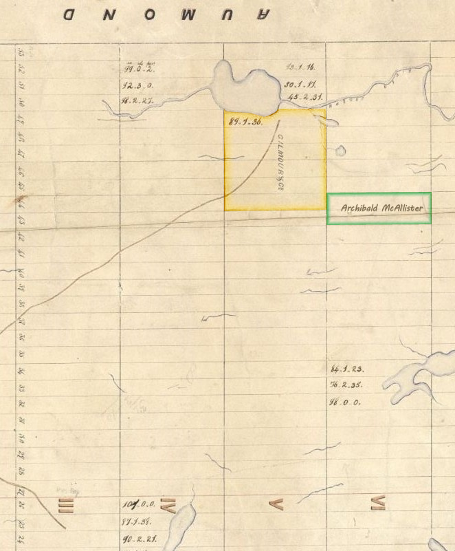 The rental ticket of lot 43 obtained in 1895 by Pierre Rivet was transferred to James Millar before being transferred again, on October 15, 1909, to Archibald McAllister. According to the census however, McAllister already occupied the lot 8 years earlier. The lots of Archibald McAllister are directly south-east of the Gilmour & Company lands (Lots 44-49, Range 5, Kensington Township) as shown by a map of the Township of Kensington, 1865. The letters patent of the lots occupied by Archibald McAllister are issued August 2, 1910.