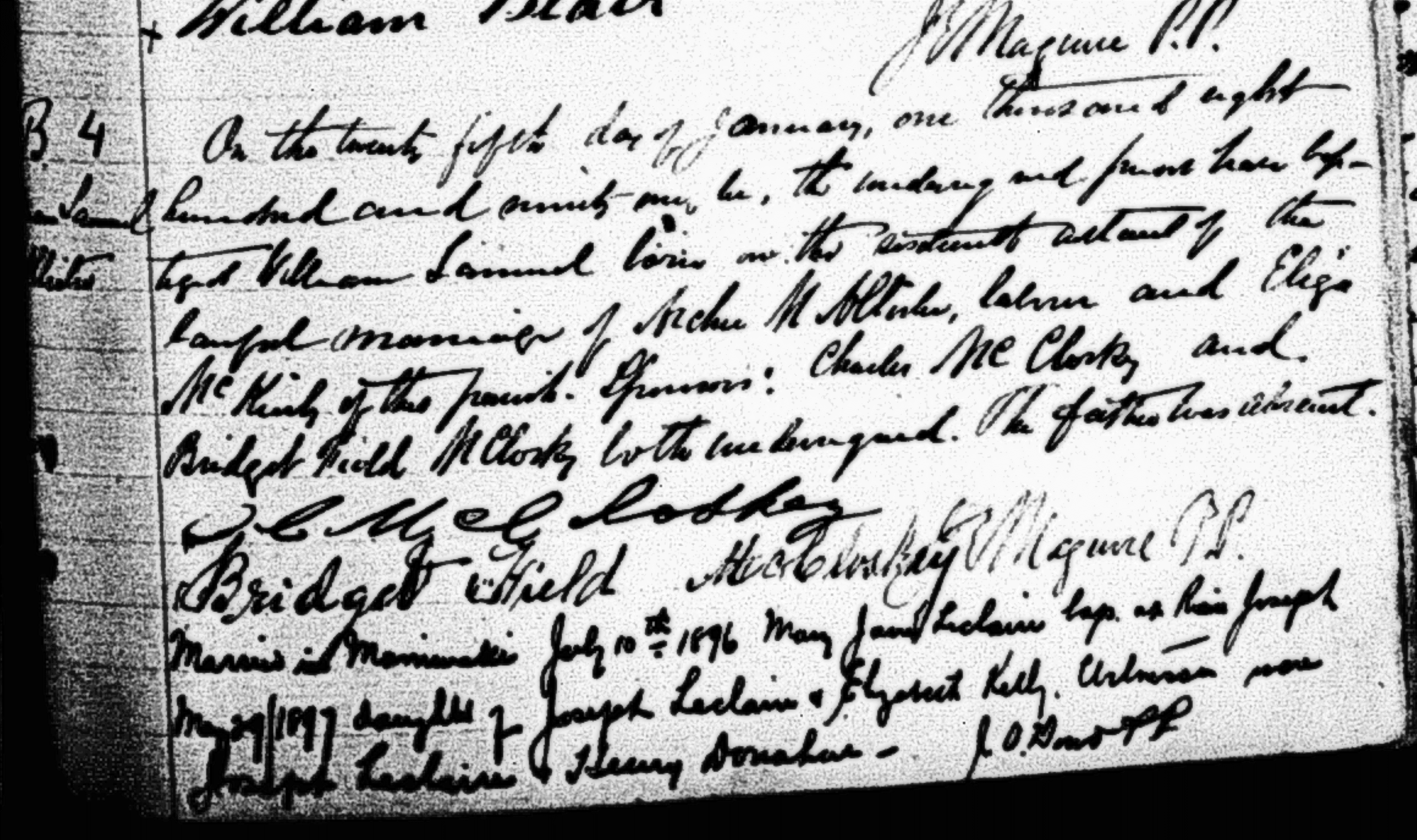 The third child born in Canada is William Samuel McAllister who is known as William. He was born on January 16, 1891 and was baptized on January 25, 1891 in Saint Stephen, Chelsea. It is stated that Archibald is a laborer and still lives in this parish with his wife. The godparents are Charles McClosky and Bridget Field.