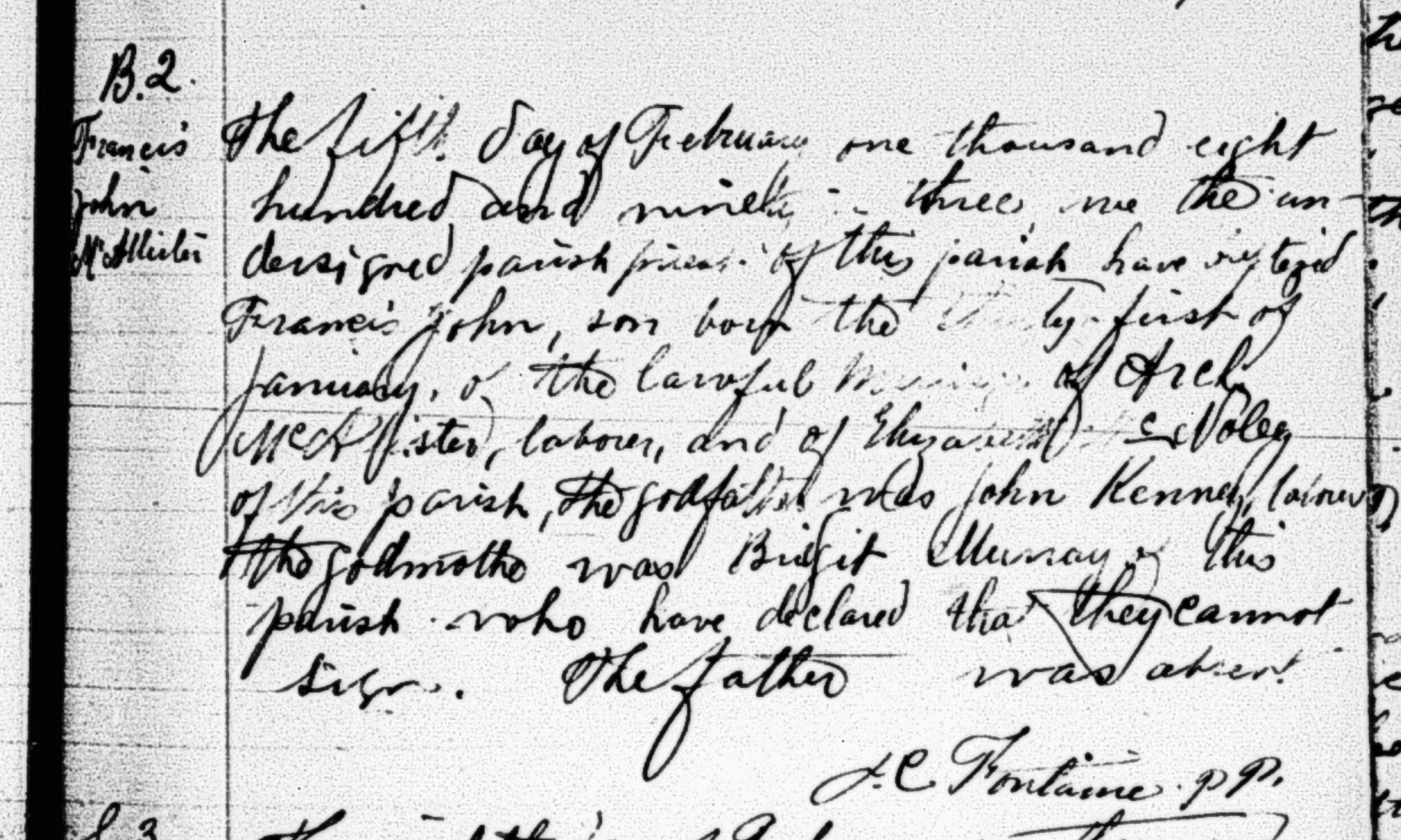 It is certain that Mary McMullan is pregnant at the time of her marriage since a few months later, on September 7, 1833, her daughter Margaret McAllister is baptized. The baptism is recorded in the register of the parish of Drumaul. The act mentions that the parents are from Ballygrooby.