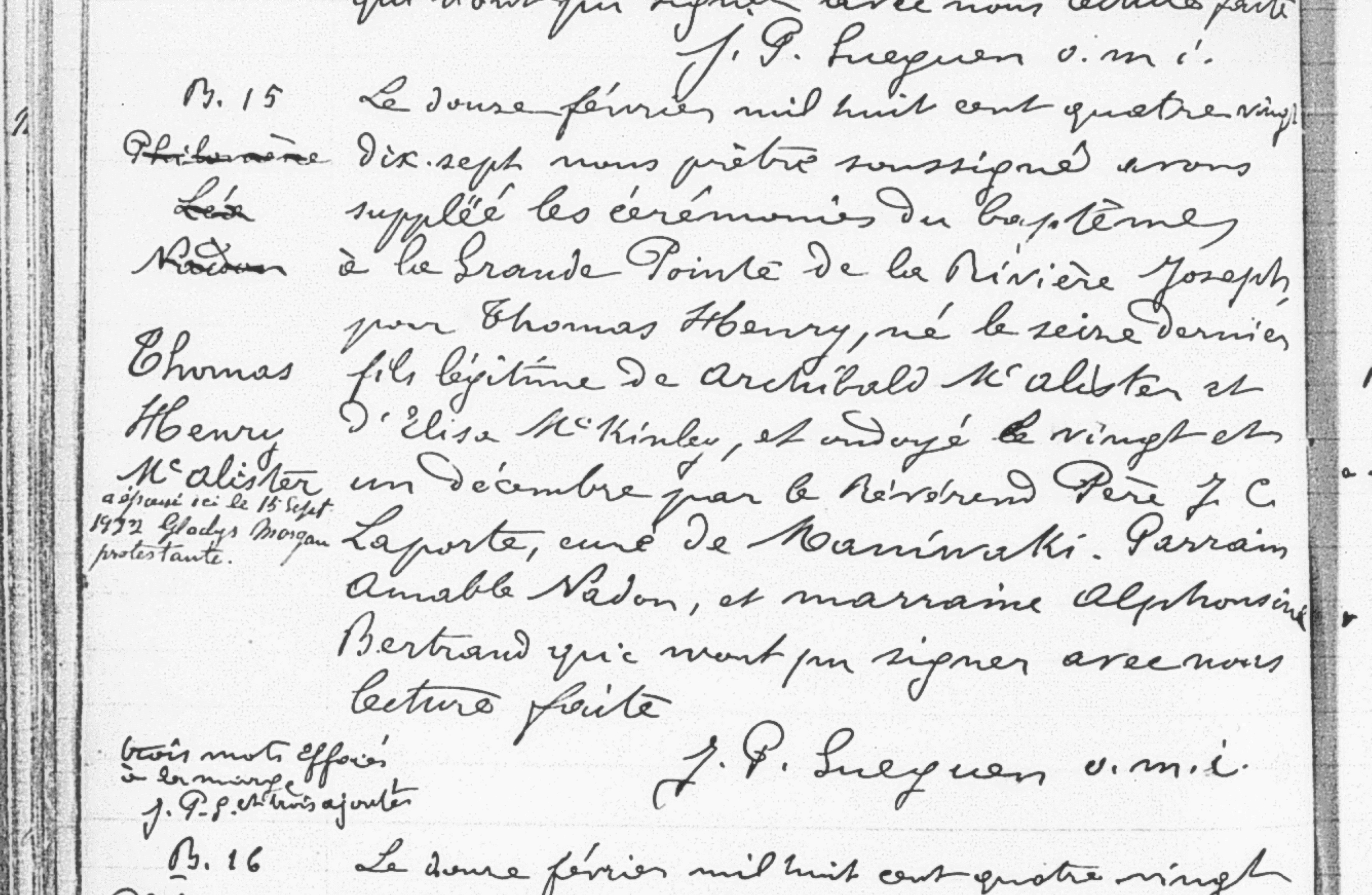 A last child was born December 16, 1896 of the marriage of Archibald McAllister and Eliza McKinley: Thomas Henry McAllister. It is very likely that his parents feared for the life of the child since his baptism mentions that he was baptized under conditions on December 21, 1896 by the Reverend Father J. C. Laporte. The baptismal certificate also reveals that the family moved to the Upper Gatineau in the meantime. The baptismal certificate is recorded in the parish registers of the Assumption of the Blessed Virgin Mary of Maniwaki and it indicates that baptism took place at the « Great Point of the Joseph River ». The godfather and godmother of the child are Amable Nadon and Alphonsine Bertrand.