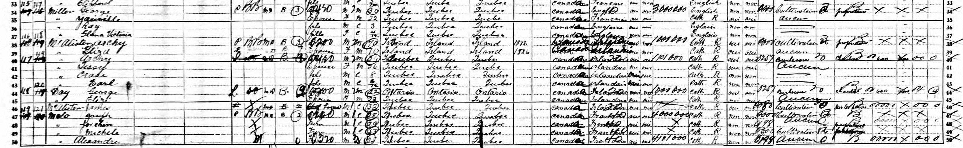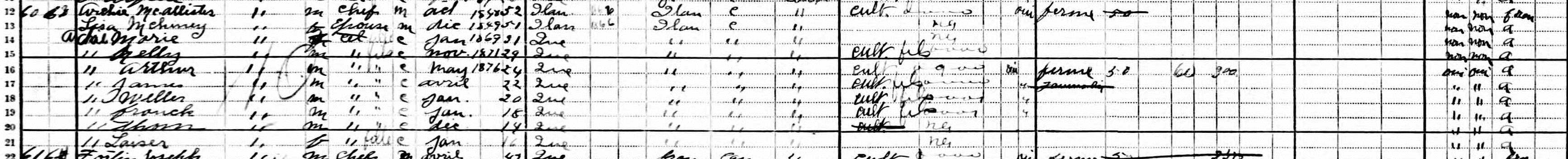 At the 1911 census, the family is still in Kensington Township. Sarah has been married since 1901 and no longer lives with her parents. All the other children are there: Mary, Nellie, Arthur [Archie], James, Willie [William], Frank, Thom [Thomas Henry] and Laiser [Elizabeth]. The census tells us that Archibald is a farmer and works on the farm while being his own boss. His son Archie also works on the farm and, in 1910, he worked 50 weeks of 60 hours and earned $ 300. The family is English-speaking, but Archibald knows French. The census finally indicates that Archibald McAllister, Eliza McKinley and their two daughters Mary and Nellie can neither read nor write.