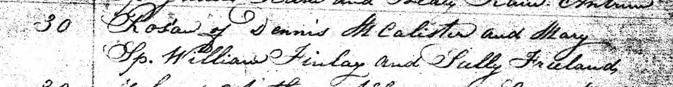 On August 30, 1835, a second daughter joins the family of Ennis McAllister and Mary McMullan. The baptism of their daughter Rosan is inscribed in the register of the parish of Drumaul. The godfather is William Finlay and the godmother is Sally Freeland.