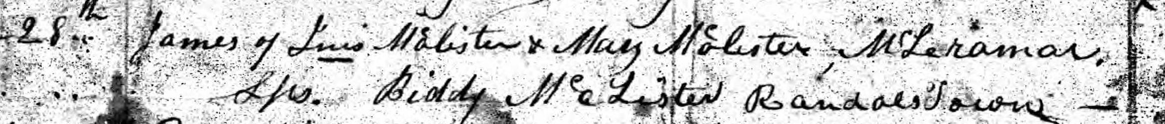 A second son joins the family of Ennis McAllister and Mary McMullan. James McAllister is baptized in Drumaul Parish and his parents report living in McLeramar [Muckleramer]. The godmother is Biddy [Bridget] McAllister from Randalstown.