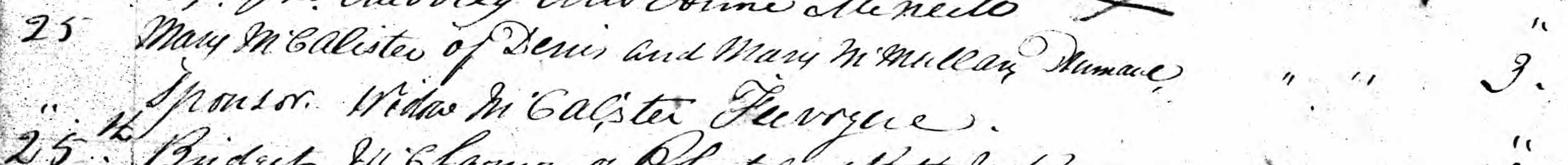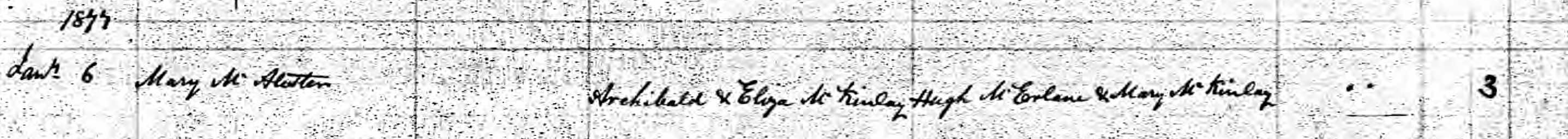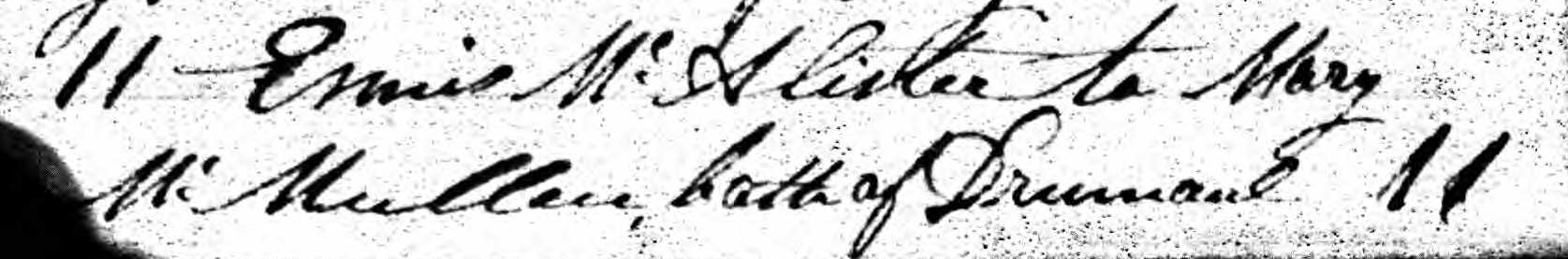 The register of Drumaul Parish records the baptism of another child of Ennis McAllister and Mary McMullan: Alexander McAllister. His godfather is John Henry and his godmother is Ann McAulay of Muckleramer.