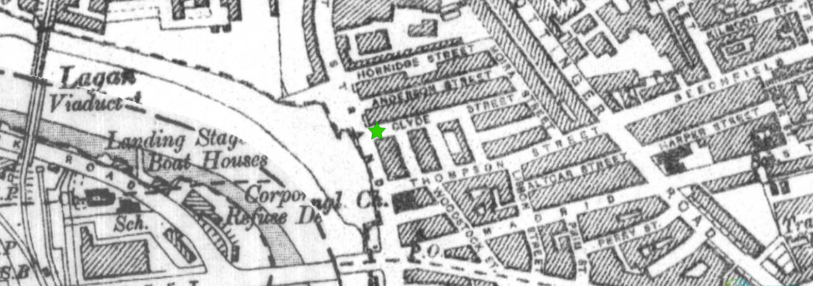 Clyde Street of the late 19th century no longer exists today. The third edition of the Ordnance Survey of Northern Ireland shows that Clyde Street was located east of the Lagan River north of the East Bridge. In today’s Belfast, this neighborhood has been redeveloped and is located here.