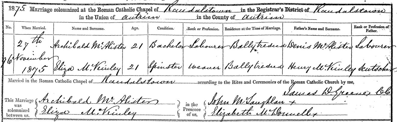 The civil registration of marriage offers much more information. First of all, the wedding location is much more precise. The wedding took place in the Randalstown Catholic Chapel in County Antrim. Archibald is a 21-year-old bachelor. He is the son of Denis McAlister [Ennis McAllister] and is a labourer just like his father. Eliza is a 21-year-old spinster and is a weaver. Her father, Henry McKinley is a scutcher, which means that he operates an implement for separating hemp or flax from the stalk. Archibald and Eliza live in Ballytresna, just north of Randalstown.