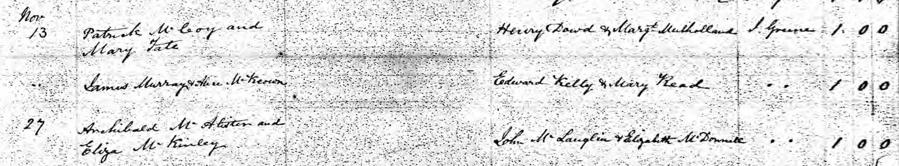 It took four years before the Drumaul parish register record other acts concerning Ennis and Mary’s children. These are the baptisms of two boys: Samuel and Patrick McAllister. The parents declare to be Muckleramer. The witnesses are Mrs. Steenson and Margaret McAlister.