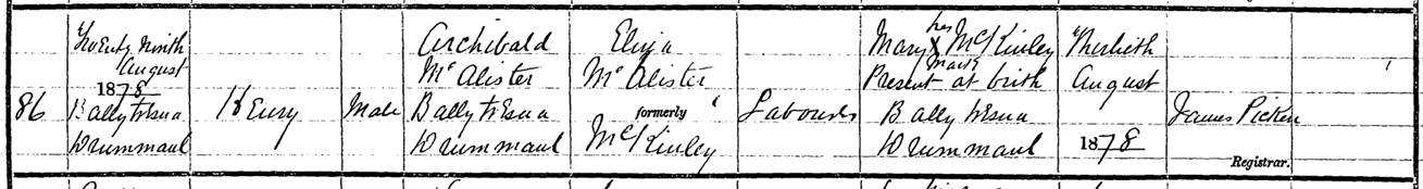 A second child is born a year and a half later. On August 29, 1878, the birth of Henry McAllister was officially registered with the Registrar on August 13, 1878. The child was born in Ballytresna in the parish of Drumaul, the place of residence of his parents. Archibald claims to be a labourer and Mary McKinley, his godmother, claims to have been present at birth.