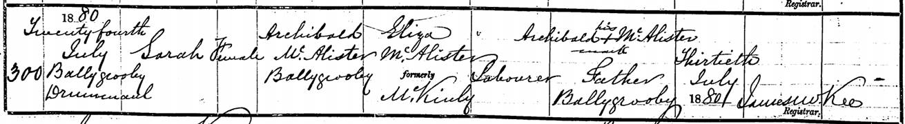 On July 24, 1880, Sarah was born in Ballygrooby where Archibald McAllister and Eliza McKinley now live. Archibald is still a labourer and the birth is recorded on July 30, 1880. Ballygrooby is located east of the Maine River near Randalstown. The Catholic chapel is built in this townland.