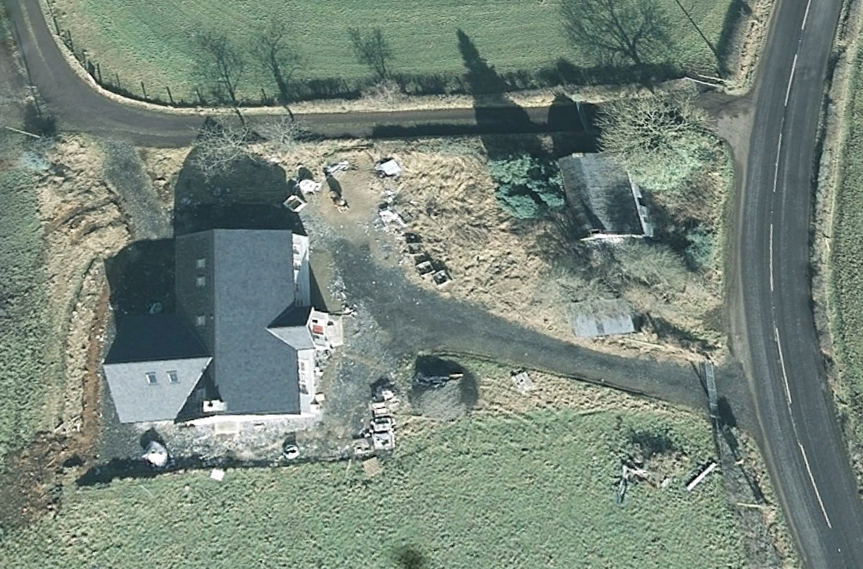 The satellite image below, from 2010, shows the location of Lot 9a in Muckleramer townland. In July 2018, while visiting during my summer holidays, it emerged from a discussion with the owner that the house on the left is a recent construction and that the building on the right is the original house dating back to the 19th century.